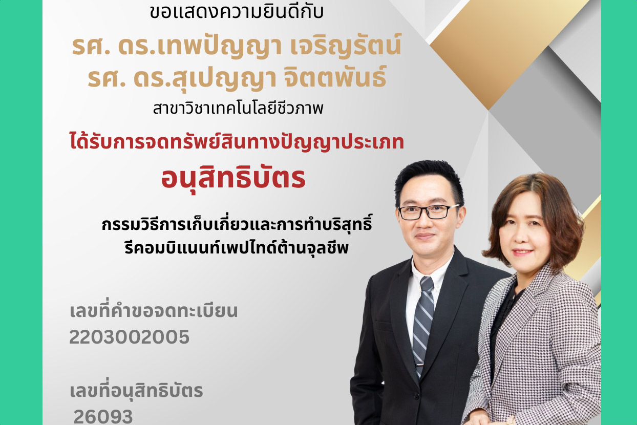 รศ. ดร.เทพปัญญา เจริญรัตน์ ได้รับการจดทรัพย์สินทางปัญญา อนุสิทธิบัตร คณะวิทยาศาสตร์และเทคโนโลยี ในเดือนกุมภาพันธ์ พ.ศ. 2568