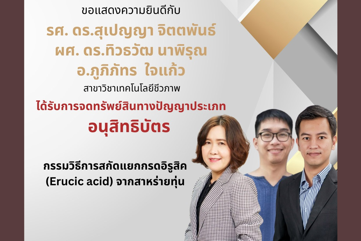 กรรมวิธีการสกัดแยกกรดอิรูสิค (Erucic acid) จากสาหร่ายทุ่น โดย รศ. ดร.สุเปญญา จิตตพันธ์ ผศ. ดร.ทิวธวัฒ นาพิรุณ และ อ.ภูภิภัทร ใจแก้ว