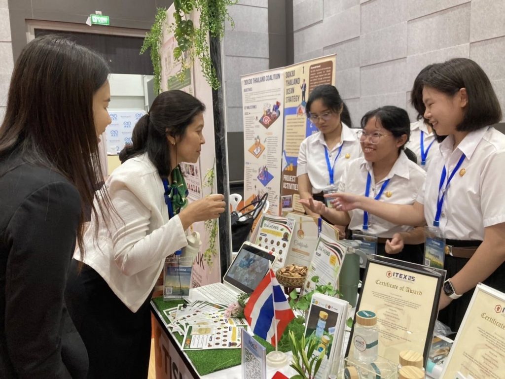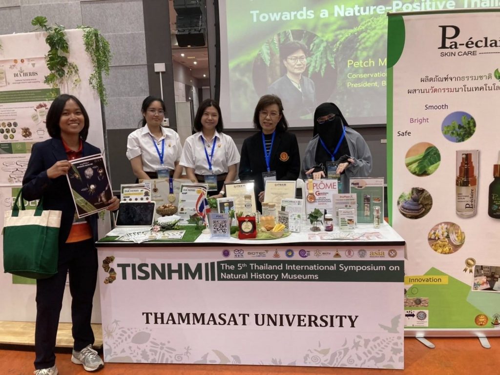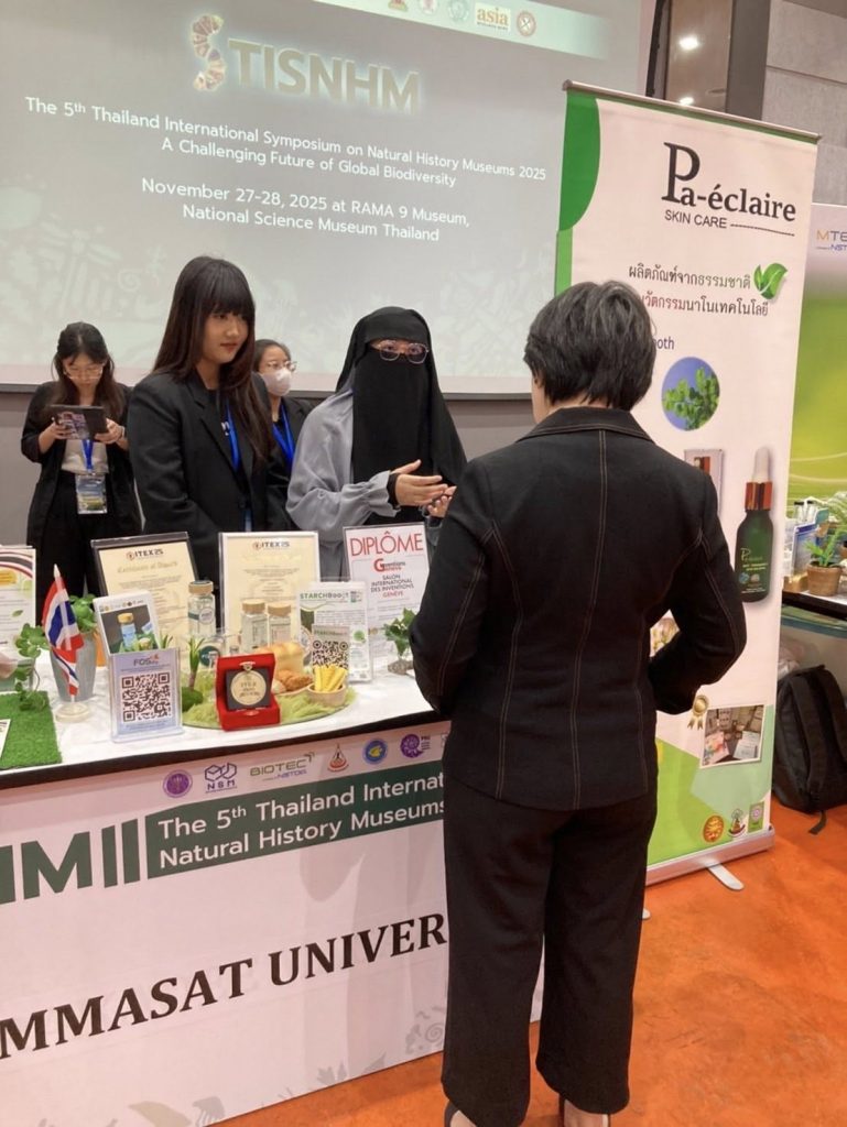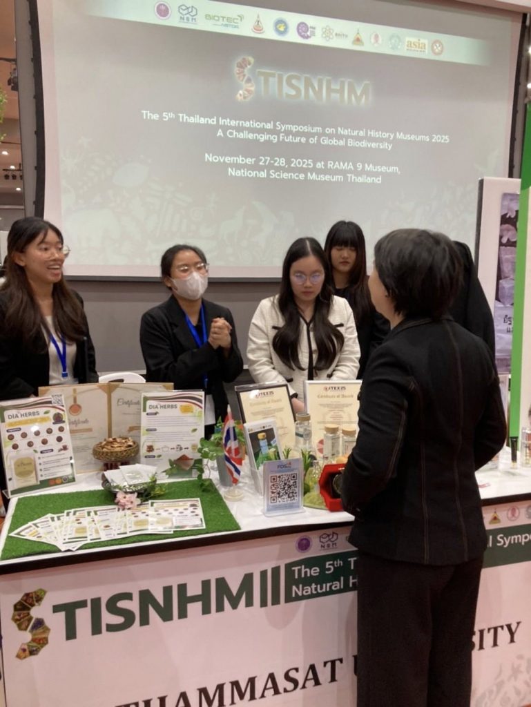 ภาพบรรยากาศอาจารย์และนักศึกษาสาขาวิชาเทคโนโลยีชีวภาพ คณะวิทยาศาสตร์และเทคโนโลยี มหาวิทยาลัยธรรมศาสตร์ ออกบูธแนะนำผลงานนวัตกรรมจากสาขาและประชาสัมพันธ์หลักสูตรฯ ในงานสัมมนาวิชาการนานาชาติ The 5th Thailand International Symposium on Natural History Museums 2025 (TISNHM 2025) ระหว่างวันที่ 27-29 พฤศจิกายน 2568 ณ พิพิธภัณฑ์พระรามเก้า องค์การพิพิธภัณฑ์วิทยาศาสตร์แห่งชาติ (อพวช.) จังหวัดปทุมธานี