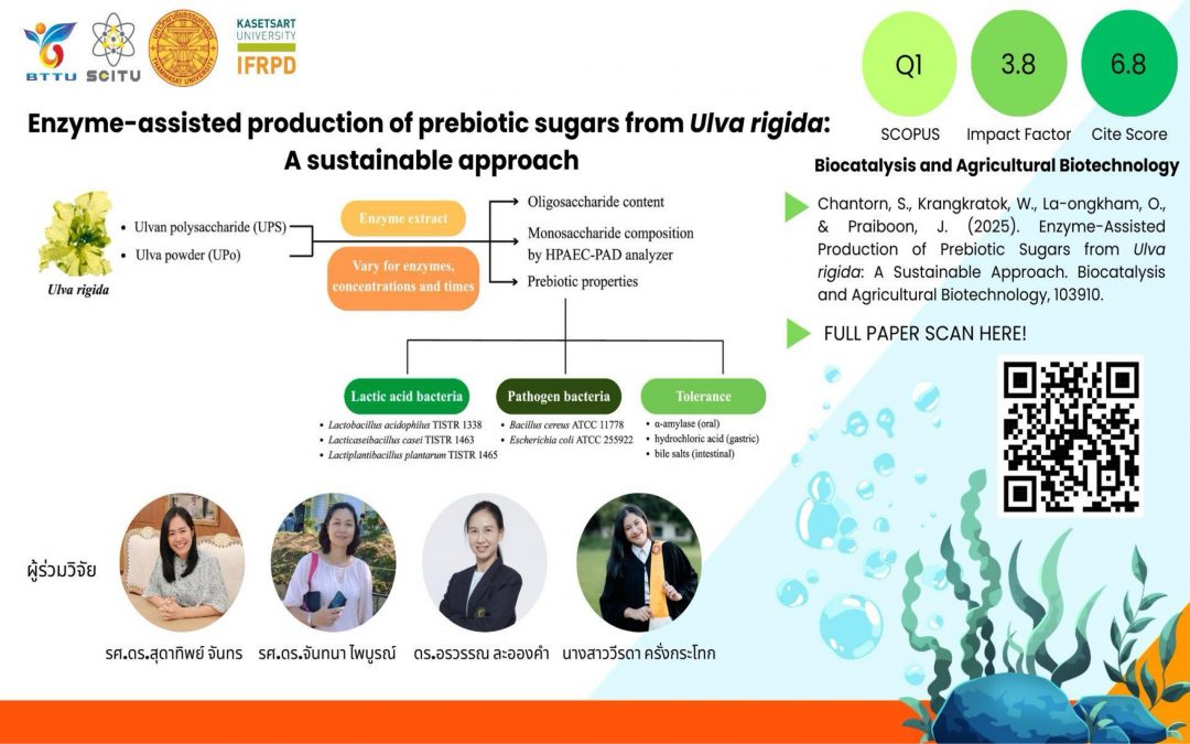 ทีมวิจัยได้ศึกษาสาหร่ายผักกาดทะเลซึ่งเป็นหนึ่งในอาหารฟังก์ชันที่ได้รับความสนใจอย่างมากในปัจจุบัน โดยงานวิจัยนี้มีวัตถุประสงค์เพื่อผลิตโอลิโกแซกคาไรด์จากสาหร่ายผักกาดทะเลด้วยเทคโนโลยีเอนไซม์และทดสอบสมบัติความเป็นสารพรีไบโอติกของสารสกัดจากสาหร่ายผักกาดทะเล